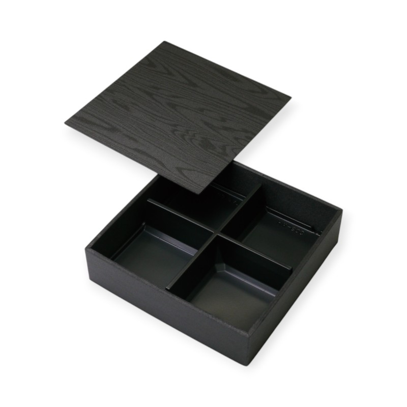 | 商品説明 | 高級感のある折箱。仕切りは9仕切りあり、幕の内弁当や9枡弁当として高価格のメニューで販売可能です。 |