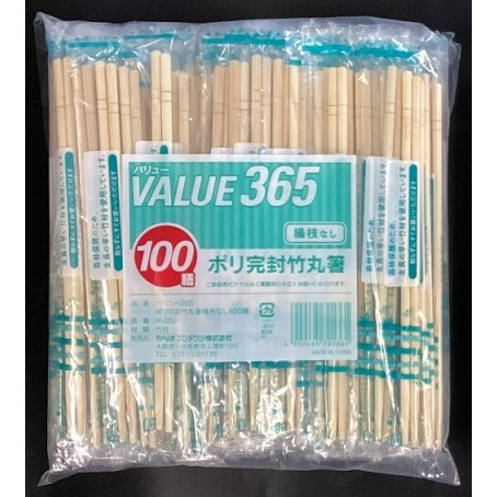割箸 バリュー365 ポリ完封竹丸箸 楊枝入 100膳 やなぎプロダクツ