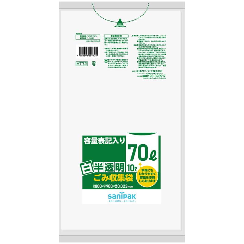 HDゴミ袋 容量表記入り 白半透明ごみ収集袋 90L 10枚 0.023mm 日本サニパック