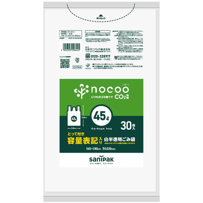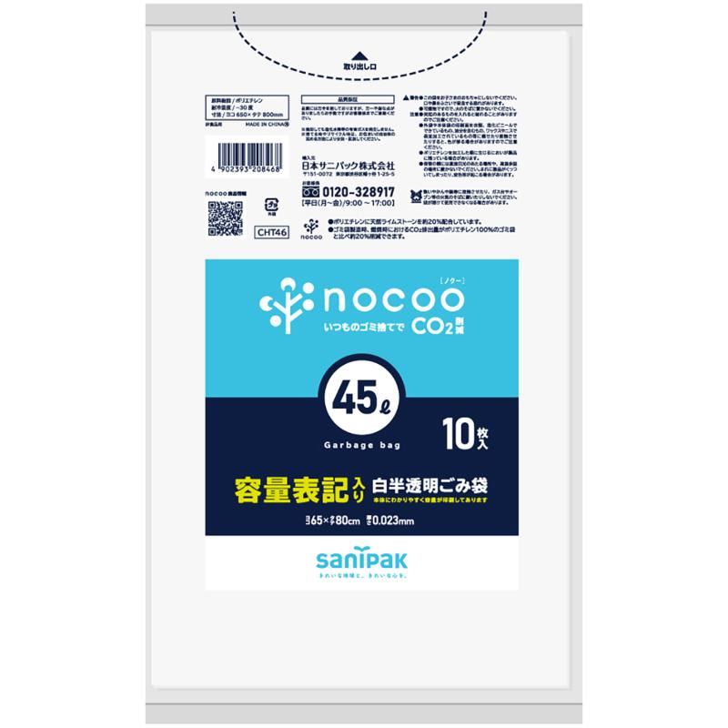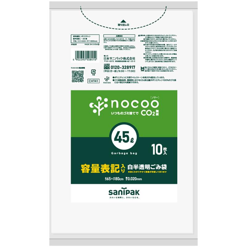 HDゴミ袋 nocoo(ノクー) 容量表記入り 白半透明ごみ収集袋 省資源 45L 10枚 0.015mm 日本サニパック