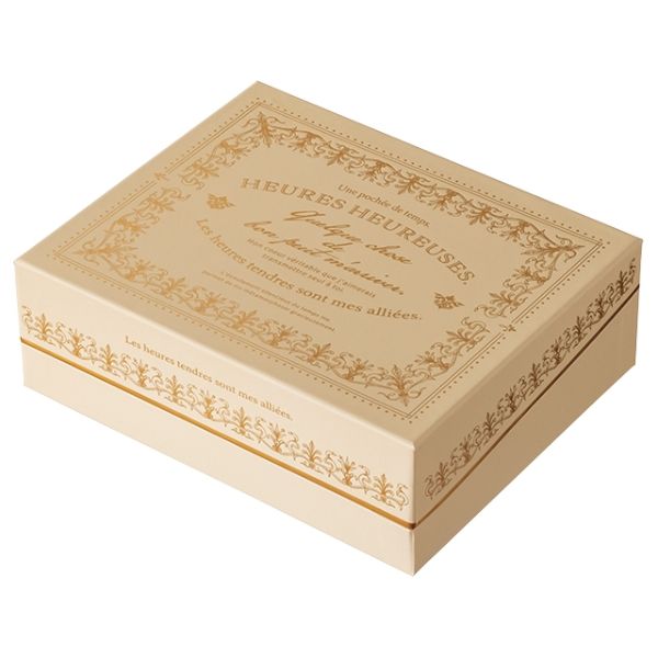 | 商品説明 | 金の箔押しが高級感たっぷりのエレガントな貼箱です。内側にも全面デザイン入りで、中身と一緒に贅沢な時間を演出してくれます。フタをオープンにしたまま固定できるため、店頭展示にも大活躍。貰った後もリユースしたくなる貼箱です。定番ギフトにはもちろん、クリスマスなどのイベントにもおすすめです。 |