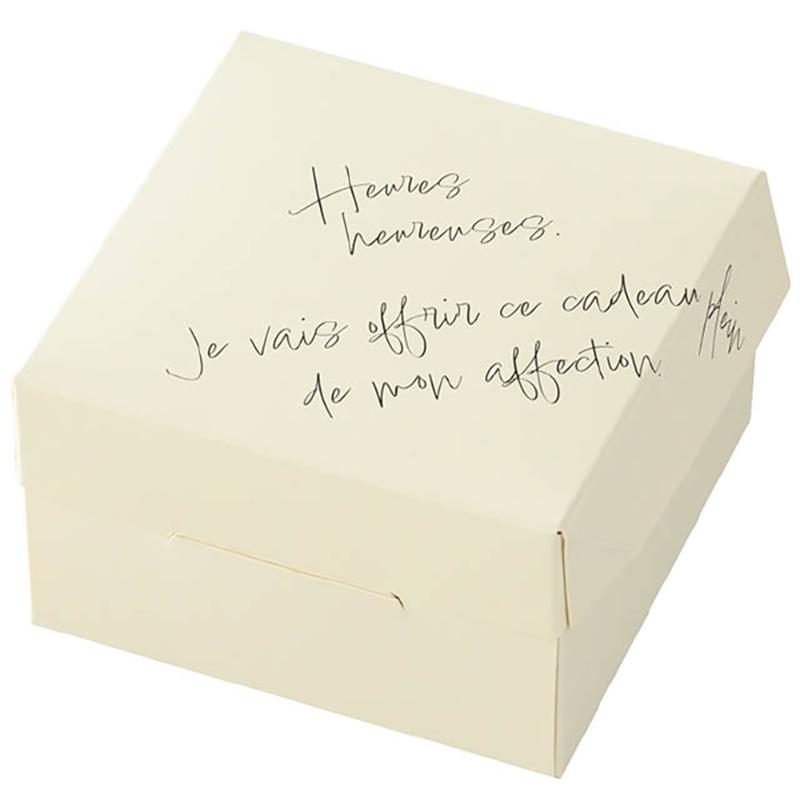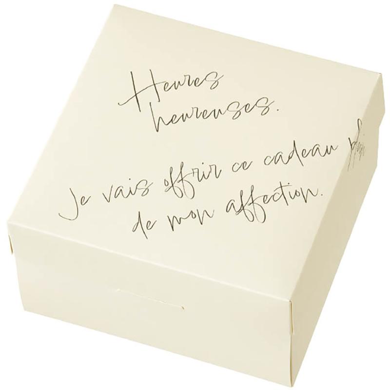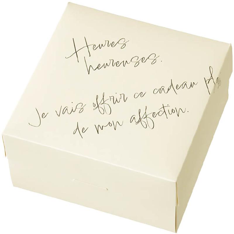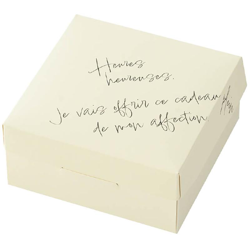 | 商品説明 | 直径15cmのガトーショコラやチーズケーキ、アップルパイ等のホールケーキに対応したケーキボックスです。フランス語のテキストデザインが入ったおしゃれなパッケージです。その他の焼菓子も入れられますのでギフトとして幅広くご使用いただけるケーキボックスです。食品対応。耐油・耐水。電子レンジやオーブン、またはオーブントースターでは使用しないでください。揚げたてのフライなど、熱いものを直接入れないでください。内面に耐水耐油加工をしておりますが、高温のものを入れると変形する場合がございます。食品衛生法適合商品。 |