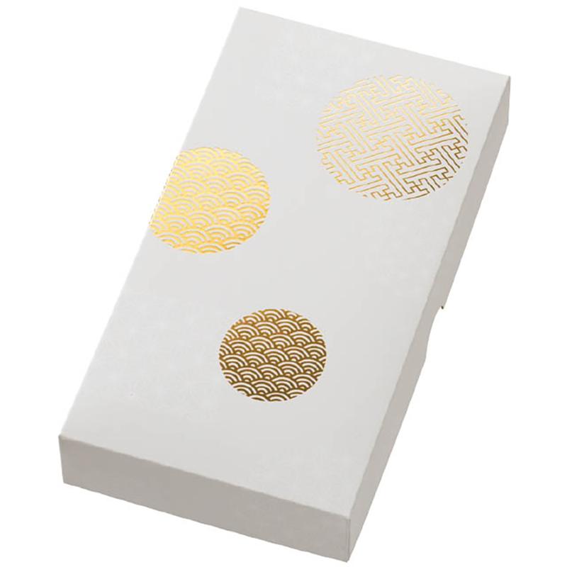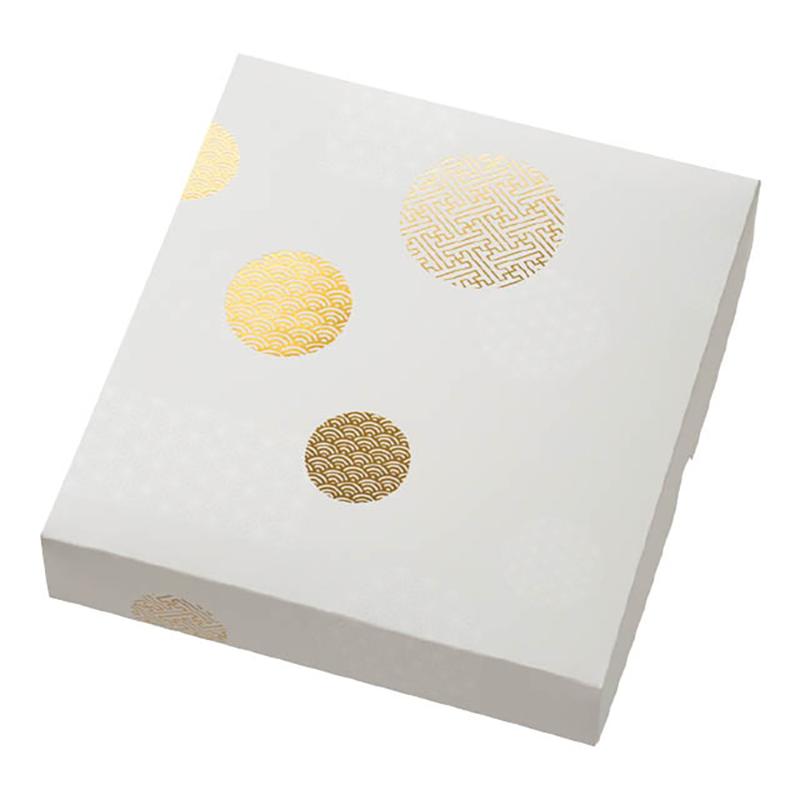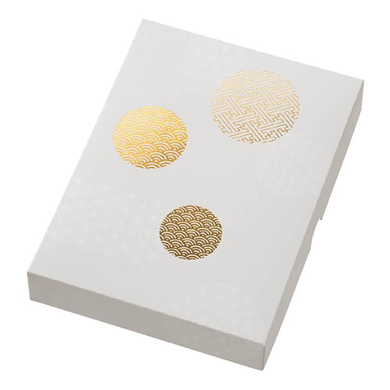 | 商品説明 | 進物用におすすめな身フタ別のギフトボックスです。青海波や麻の葉柄などの和柄がデザインされており、フタは下までかぶせられるので、包装紙もきれいにかけることができます。最中やどら焼きなどの大きめの和菓子も入れられるサイズで、種類や入数を変えてギフトをつくれます。底板付。 |