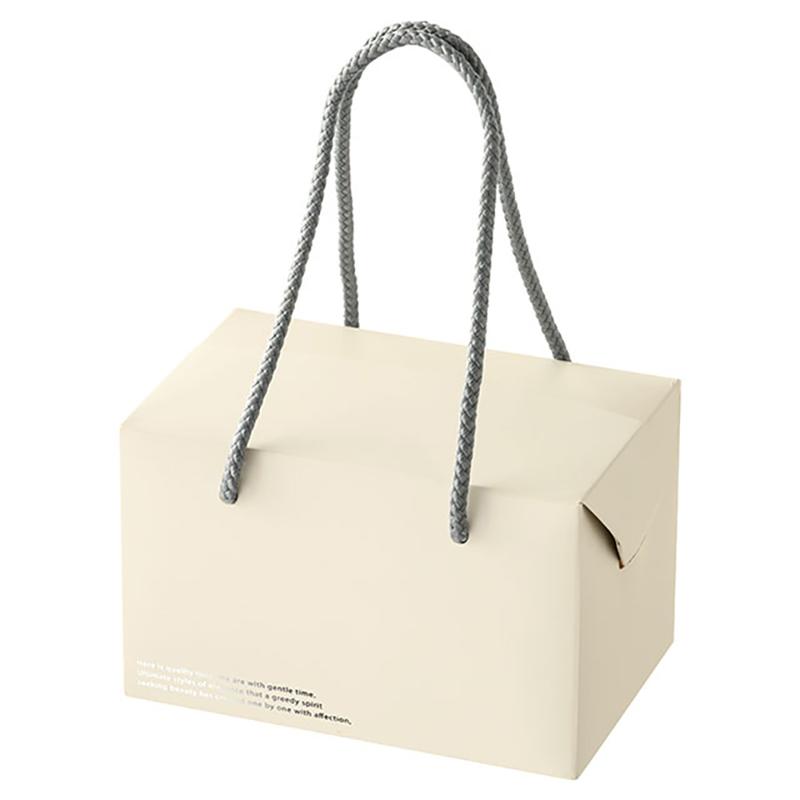 | 商品説明 | 上品なグレーの色合いが印象的なハンドル付きギフトバッグです。持ち手部分には綿ロープを使用、箱正面には銀の箔押しの英文デザインをワンポイントにあしらいました。シンプルながらも細部までこだわりを詰め込んだおしゃれなデザインのギフトボックスです。マドレーヌが約12個程度入るサイズ感で、焼きドーナツやどらやきなど焼き菓子の詰め合わせにおすすめです。綿ロープ付。耐水対応。冷凍対応。 |