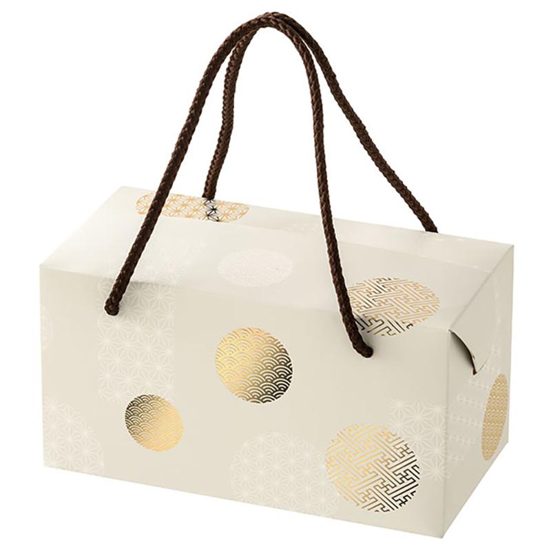 | 商品説明 | 薄グレーに和柄が印象的なハンドル付きギフトバッグです。持ち手部分には綿ロープを使用し、青海波や麻の葉など伝統的な和柄を白インクと金の箔押しで水玉模様にあしらった、上品で華やかな雰囲気のギフトボックスです。マドレーヌなら約15個、どらやきなら10個程度が入るサイズ感で、和菓子のお持たせや贈答用としておすすめのラッピング資材です。綿ロープ付。耐水対応。冷凍対応。 |