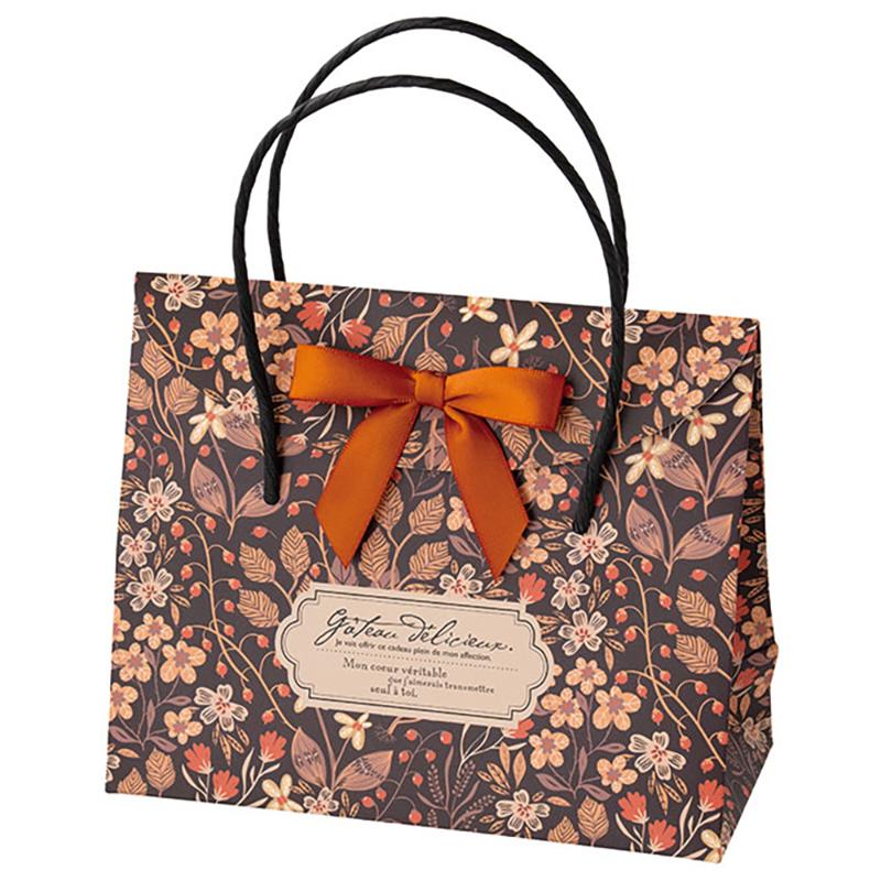 | 商品説明 | ピンクや赤、オレンジの花柄がかわいいペーパーバッグ(紙袋)です。可愛い丸いフラップで封をした後は、付属の両面テープでリボンをお好みの場所に付けるだけでラッピングが簡単に完成!忙しい時期のプチギフト作りにも活躍します。自立したハンドル付で手に取りやすく、そのままお持ち帰りいただけるのもおすすめポイントです。両面異デザイン。底板・サテンリボン・両面シール付。 |