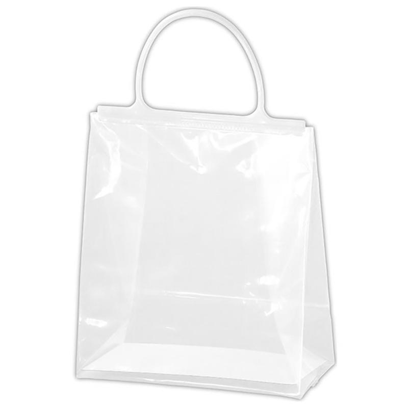 | 商品説明 | 透明無地のハンドル付クリアバッグです。透明なので商品パッケージを活かしたセットギフトが作れて、店頭でもしっかりアピールできます。ハンドル付きで手に取りやすいのもポイント。底板付きなので商品をセットしやすく、少し重めのものにも対応。ハンドルの凹凸をパチッと合わせて閉じられるので、忙しい時期用のギフトの作り置きにもおすすめです。底板付。 |