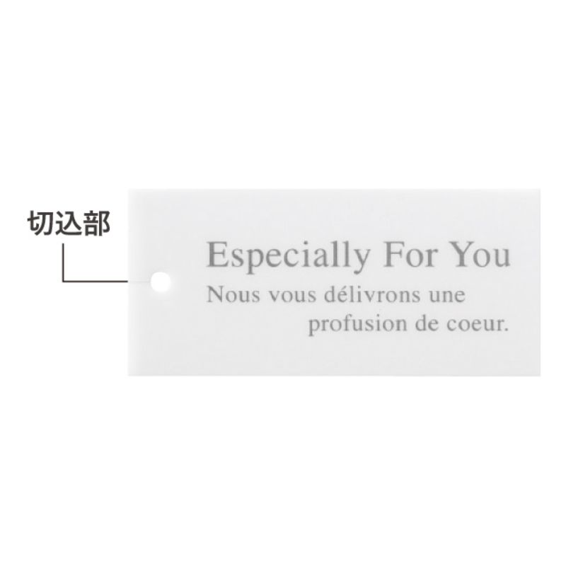 | 商品説明 | 半透明素材にシルバーの文字がおしゃれなタッグです。穴の部分に切り込みが入っているので便利です。 |