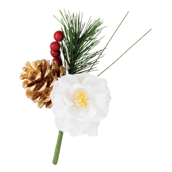 | 商品説明 | ゴールドの松ぼっくりと松、赤い実が付いた椿の造花です。フラワーアレンジメントの一部として、ラッピングパーツとして、お正月のシーンで大活躍する事間違いなし!ワイヤー付き(長さ200mm)。 |