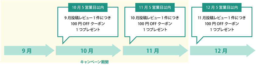 例)商品レビューを5件投稿いただいた場合 → 100円OFFクーポンを5つプレゼント!