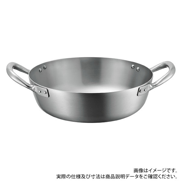| 商品規格 | サイズ:内径φ300×高さ85mm、板厚2.0mm 材質:[本体]SUS410、[取手]SUS304(18-8ステンレス) 容量:5.5L |