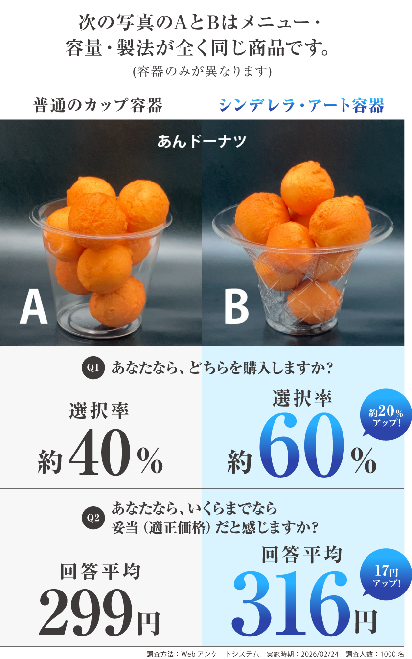 あんドーナツを例に、一般的なカップ容器とシンデレラ・アート容器で比較調査を行ったところ、後者のほうが「購入したい」「価格が多少高くても妥当」と回答する生活者の割合が高い結果となりました。