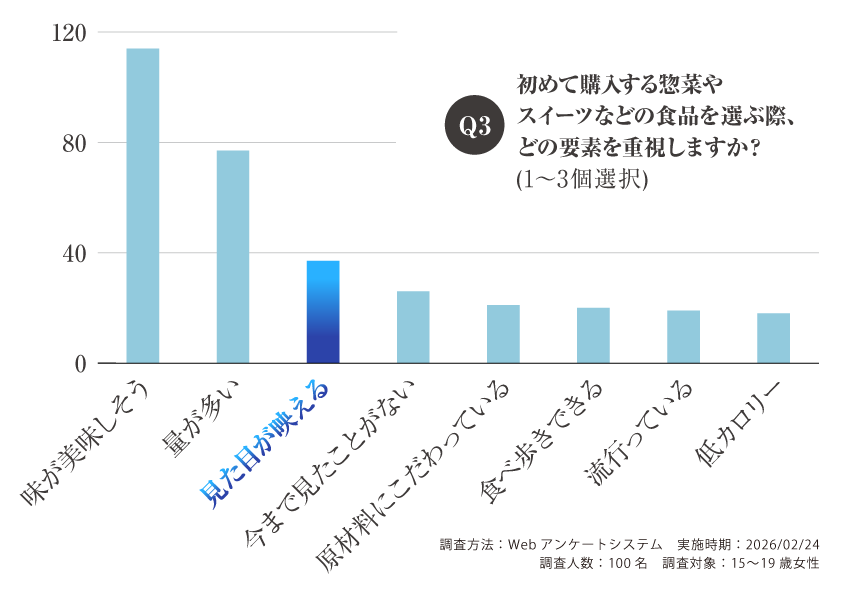 10 代女性へのアンケートでは、味やボリュームといった基本要素に次いで「見た目が映えるか」が重視されるという結果が出ています。